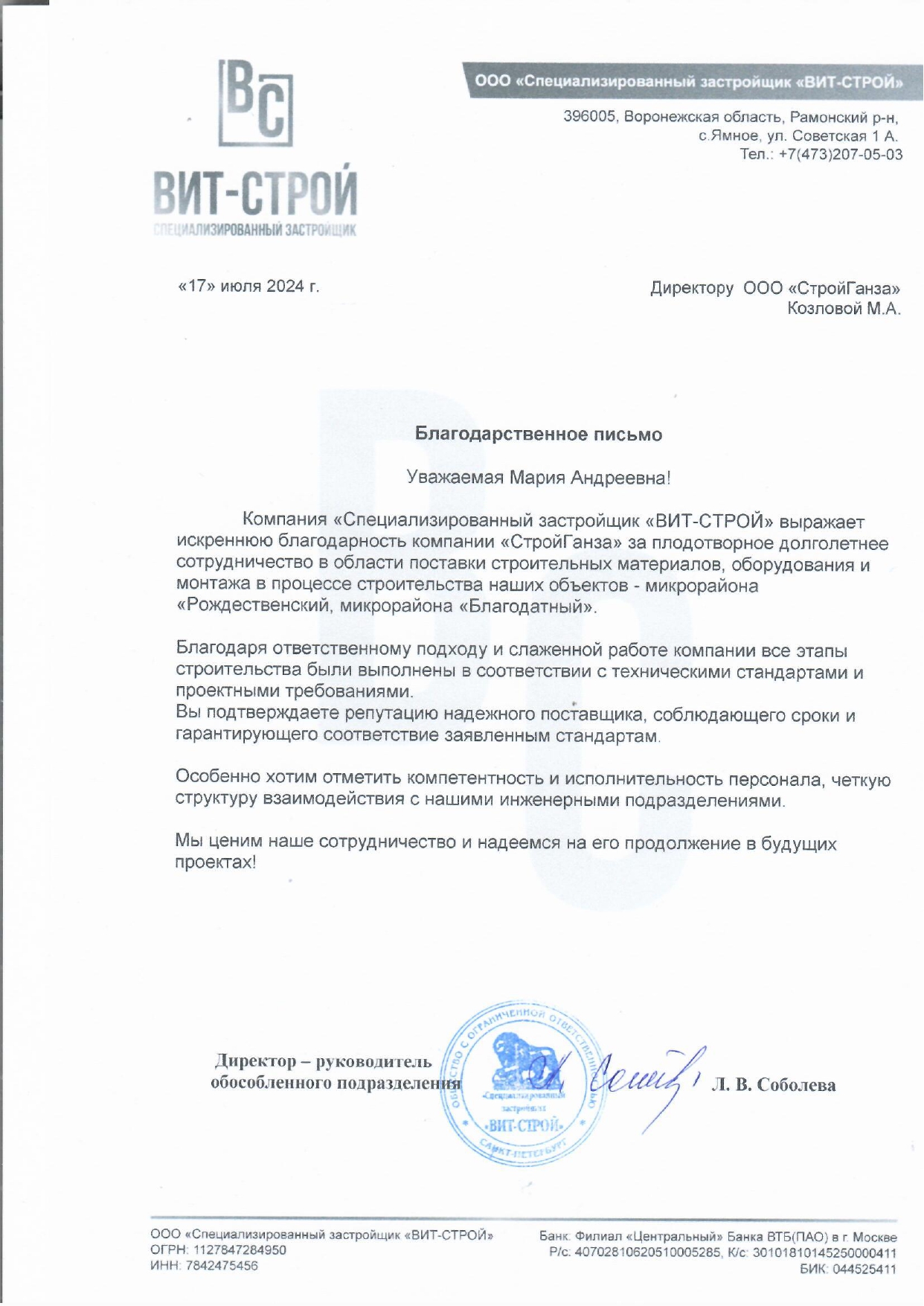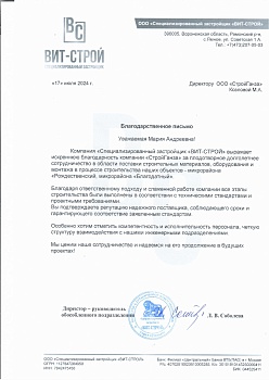 Благодарственное письмо Вит-Строй