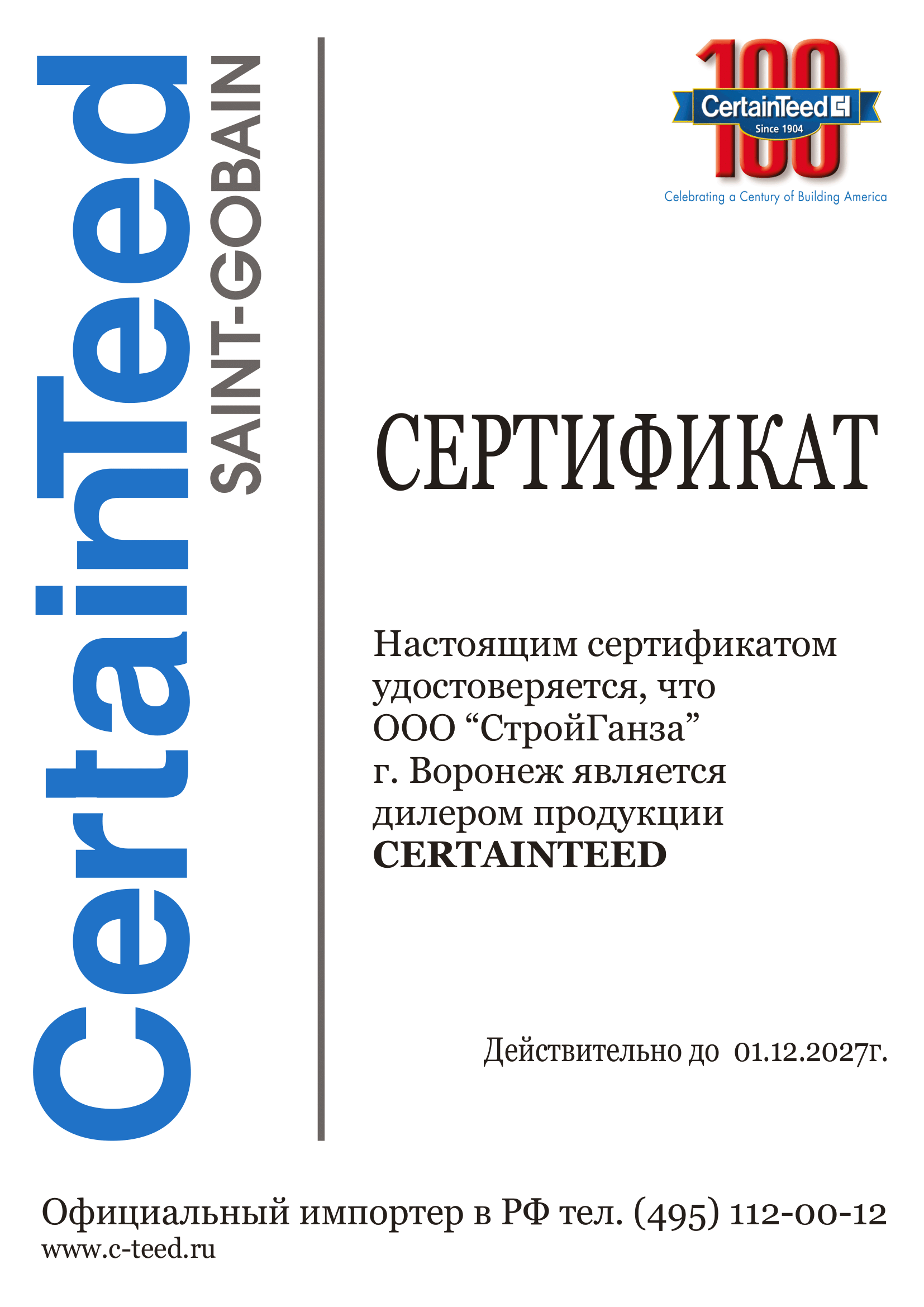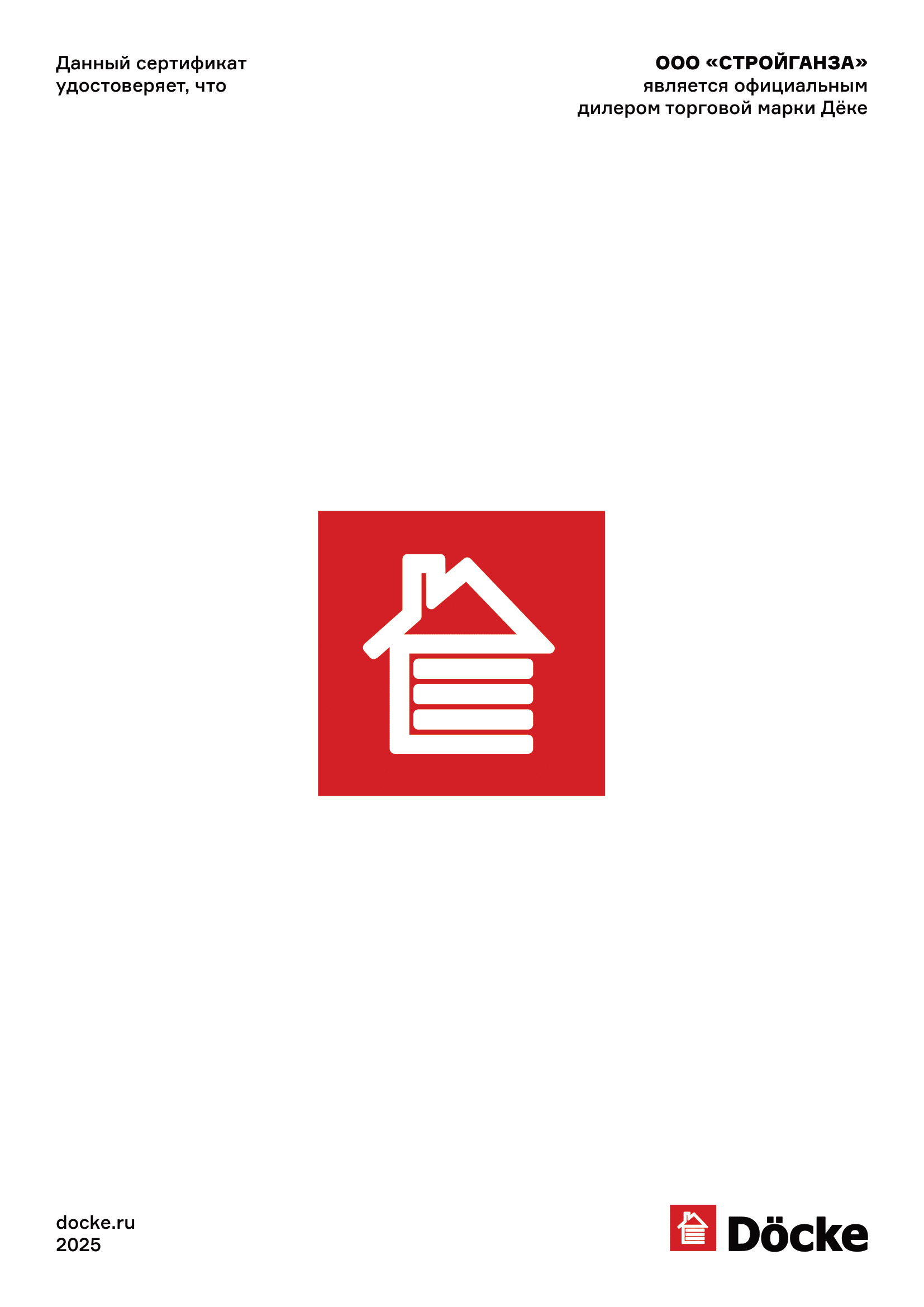 Сертификат официального дилера торговой марки Дёке